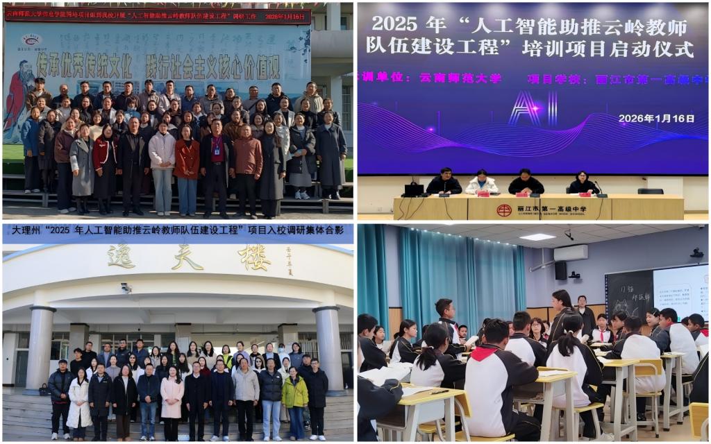 1月16日至17日,由我院承担的云南省2025年“人工智能助推云岭教师队伍建设工程”(第四区域)项目在大理州、丽江市、德宏州三地,下关第一中学(初中部)、大理州实验小学、丽江市第一高级中学、盈江县第一初级中学和芒市第四小学五所学校同步举行启动仪式。三地教育体育局代表、项目学校教师及项目管理团队共计250余人参加活动。