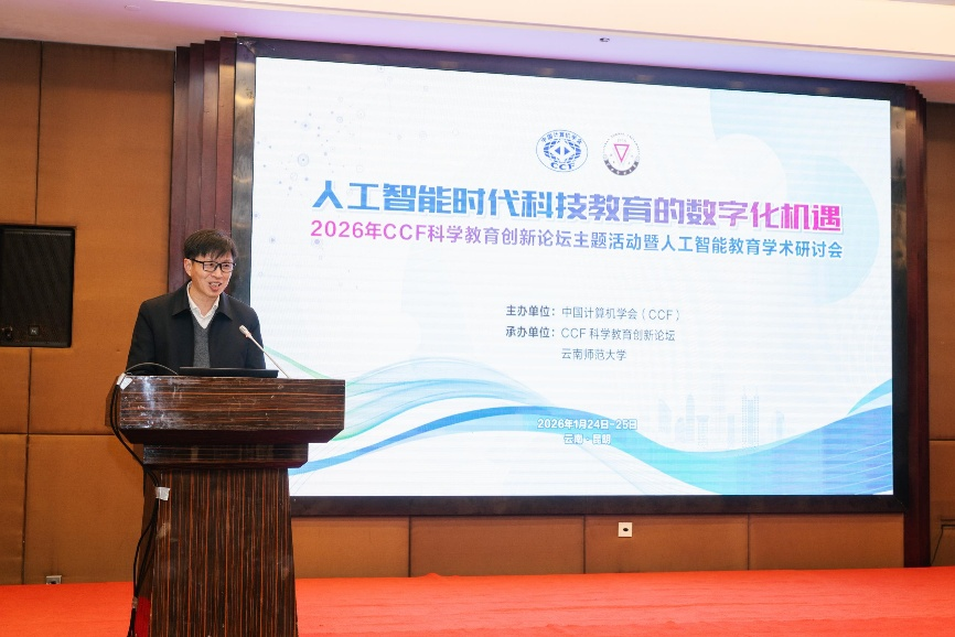 2026年1月25日,由中国计算机学会(CCF)主办、CCF科学教育创新论坛与云南师范大学联合承办的“2026年CCF科学教育创新论坛主题活动暨人工智能教育学术研讨会”在云南师范大学举行。本届论坛以“人工智能时代科技教育的数字化机遇”为主题,汇聚了来自高校、科研机构及产业界的顶尖专家学者,共同探讨人工智能与科技教育深度融合的创新路径,为教育现代化与拔尖创新人才培养注入新动能,论坛由副校长甘健侯主持。